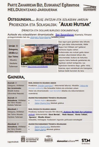 Euskaraz! Egitasmoaren barnean, Helduentzako jardueren artean, 'Aulki Hutsak' dokumenta ikusteko eta horri buruzko solasaldia egiteko aukera izango dugu. Iker Barandiaranek (Kazetaria eta dokumentalaren protagonistetako bat) gidatuko du solasaldia.